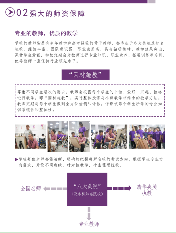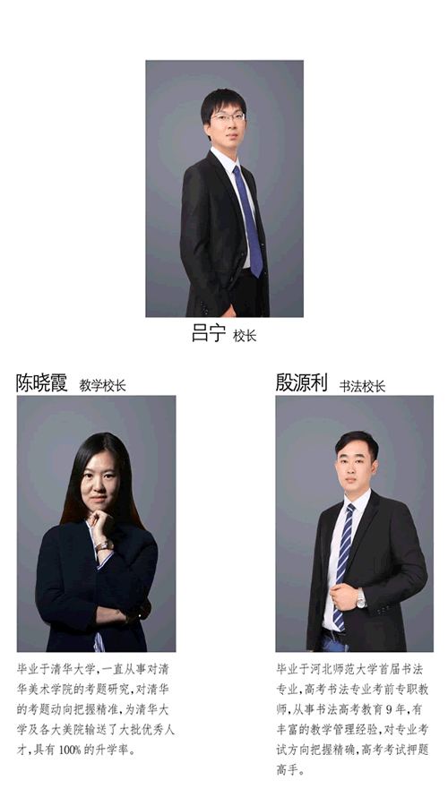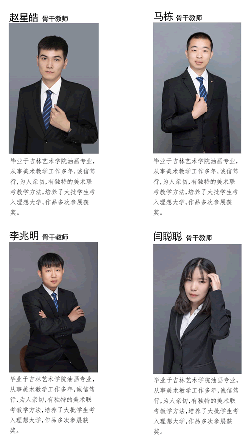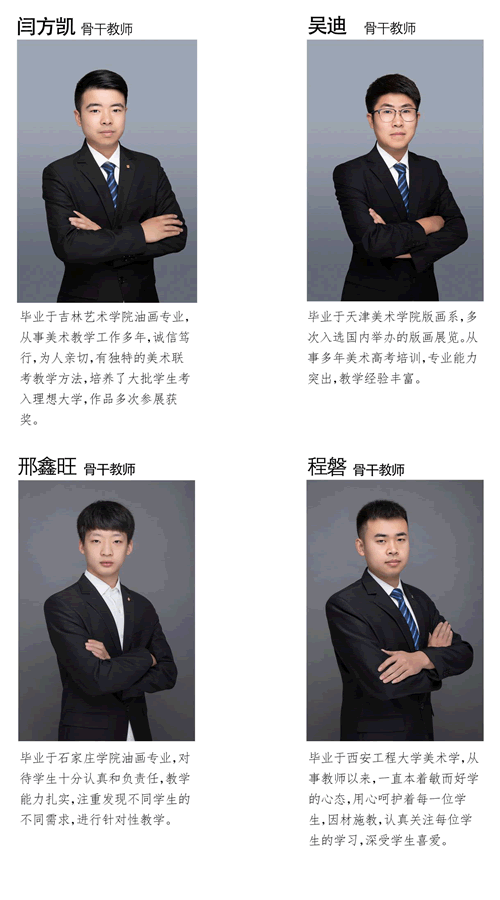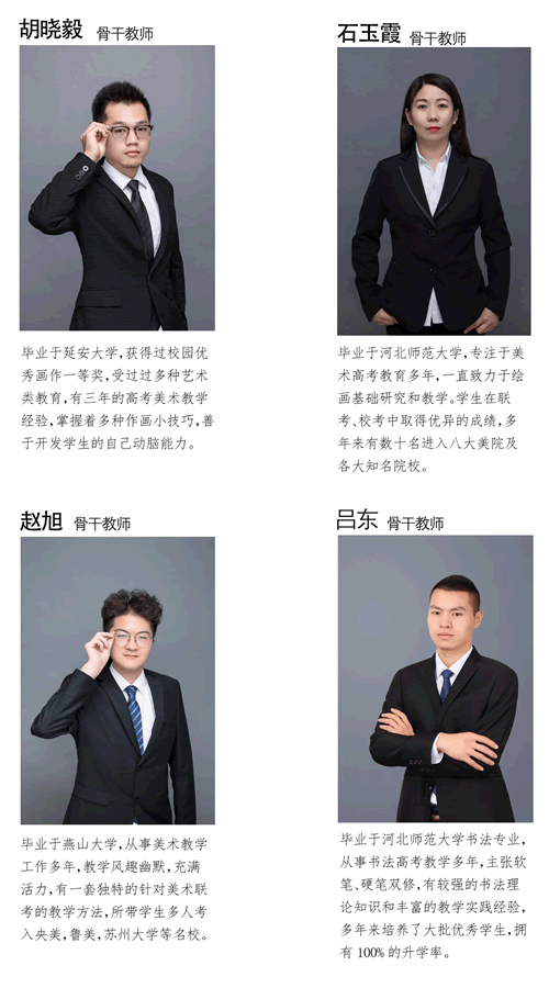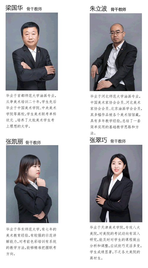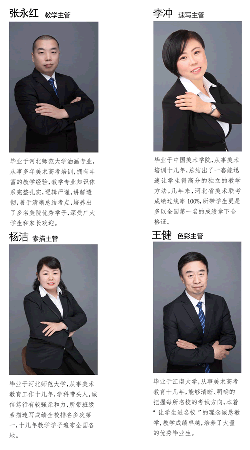 学校的教师皆是有多年教学经验和高考经验的骨干教师,都毕业于各大美院及知名院校。经验丰富、团队意识强、职业素质高、具有钻研精神、教学效果突出,深受学生爱戴。学校定期会为教师进行专业知识、职业素养、拓展训练等培训,使得教师一直保持行业领先水平。