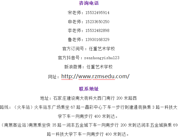 任重艺术学校是一所专业从事美术高考的培训学校。我校成立于2004年,具有正规的办学资质,任重通过十几年的努力,几经扩展,于2016年建立了新的独立校区,新校区占地20余亩,建筑面积近20000平米,采用全封闭式教学管理,地处河北科技大学西门,与河北科大,师大隔楼相望,优越的教学环境,优秀的教学理念,使得我们多年以来一直是石家庄美术培训行业的领军代表,我校成立至今,为清华大学,中央美院,各大美院及各大高校输送了数千名优秀人才,不乏其中的优秀人才毕业后,在各个岗位上发挥着重要的作用。正因如此,任重学校在河北省树立了良好的形象,赢得了各界的赞誉和肯定,随着我校知名度的提升,任重的学员也越来越多,在今天如此激烈的行业竞争中,任重本着专业,专心,专注的态度成就每一名学员的大学梦想。